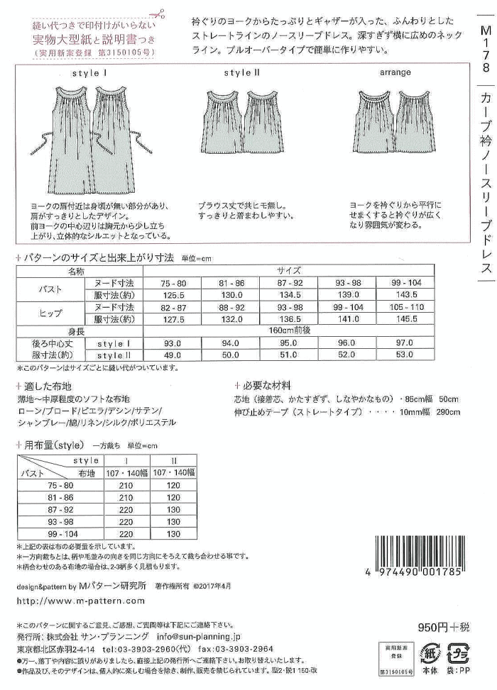 型紙 パターン カーブ衿ノースリーブワンピース No.M178 Mパターン研究所 サンプランニング